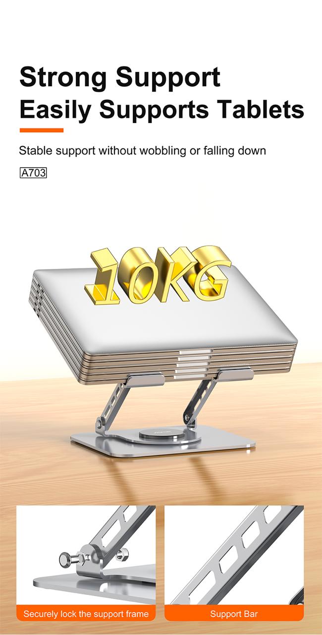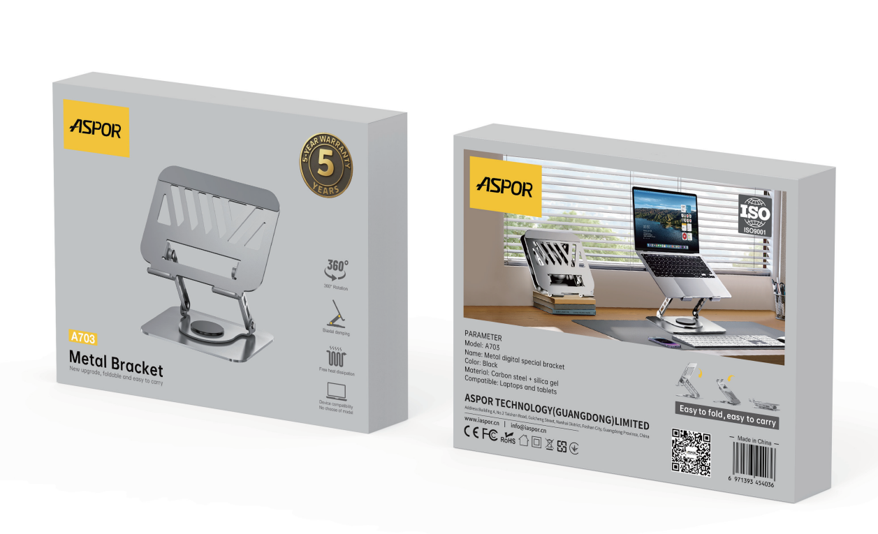 حامل اللابتوب ASPOR A703 مصنوع من الفولاذ الكربوني والسيليكون لتوفير ثبات ممتاز وحماية لجهازك من الانزلاق أو الخدوش. يتميز بتصميم قابل للطي وسهل الحمل، مما يجعله مثاليًا للاستخدام في المكتب أو أثناء التنقل.