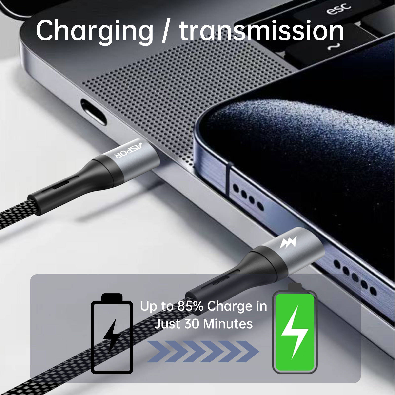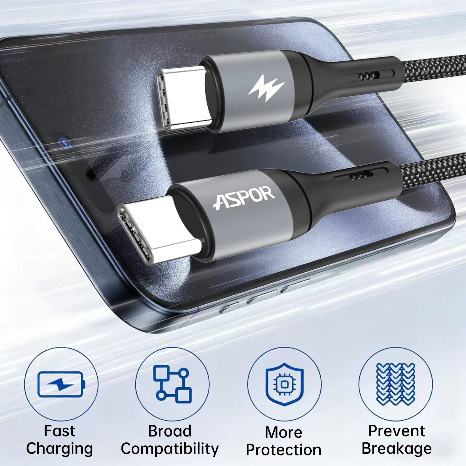احصل على تجربة شحن احترافية مع كابل ASPOR AC-21 المصمم لتقديم قوة 100 واط (100W) ⚡ مما يجعله مثاليًا لشحن أجهزة اللابتوب، الهواتف الذكية، والأجهزة اللوحية بسرعة وأمان.