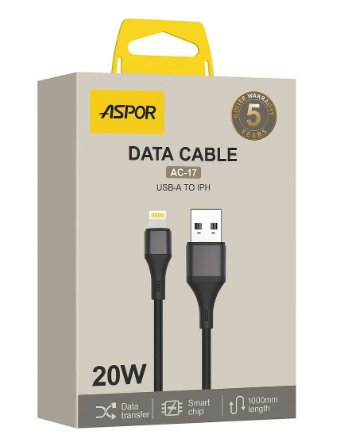 استمتع بتجربة شحن سريعة وآمنة مع كيبل ASPOR AC-17 بمنفذ USB-A إلى Lightning (IPH)، المصمم خصيصًا لأجهزة iPhone.
