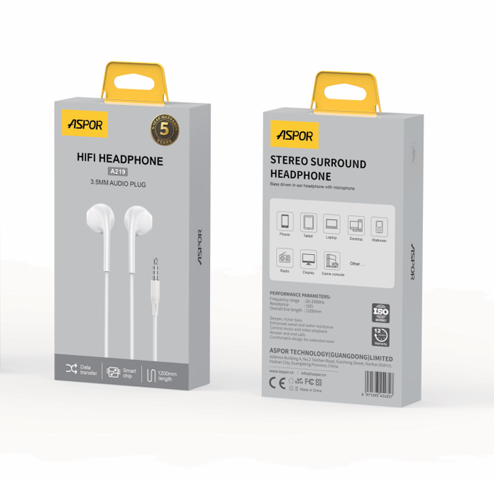 استمتع بتجربة صوت نقية وواضحة مع سماعة ASPOR A219 المزودة بمنفذ 3.5 ملم لتوافق مثالي مع جميع الأجهزة، وتصميم مريح للاستخدام الطويل.